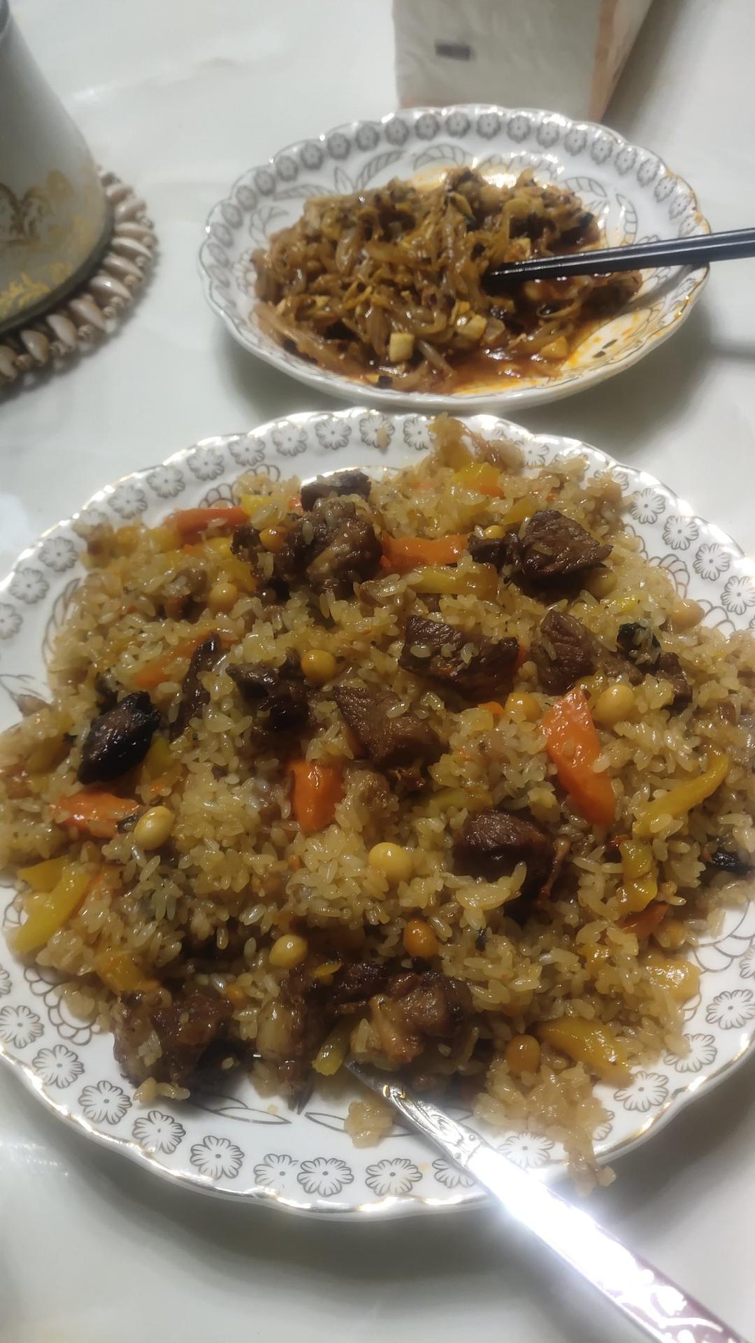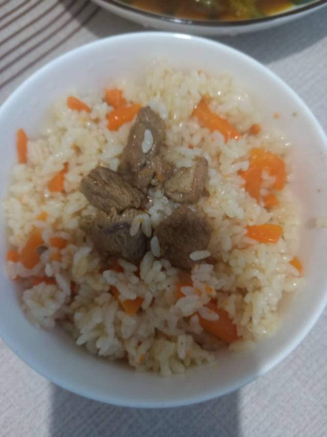 晚餐妈妈做了新疆羊肉抓饭,羊腿肉太嫩啦!家里做的抓饭就是好吃,比传统的米软一些,胡萝卜🥕甜滋滋的真棒👏🏻适合肠胃不好的呆...