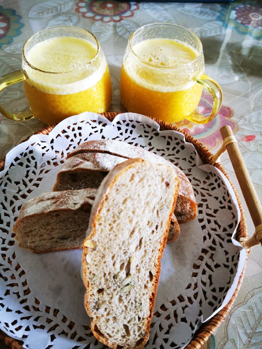 坚果软欧包+南瓜百合小米热饮 。