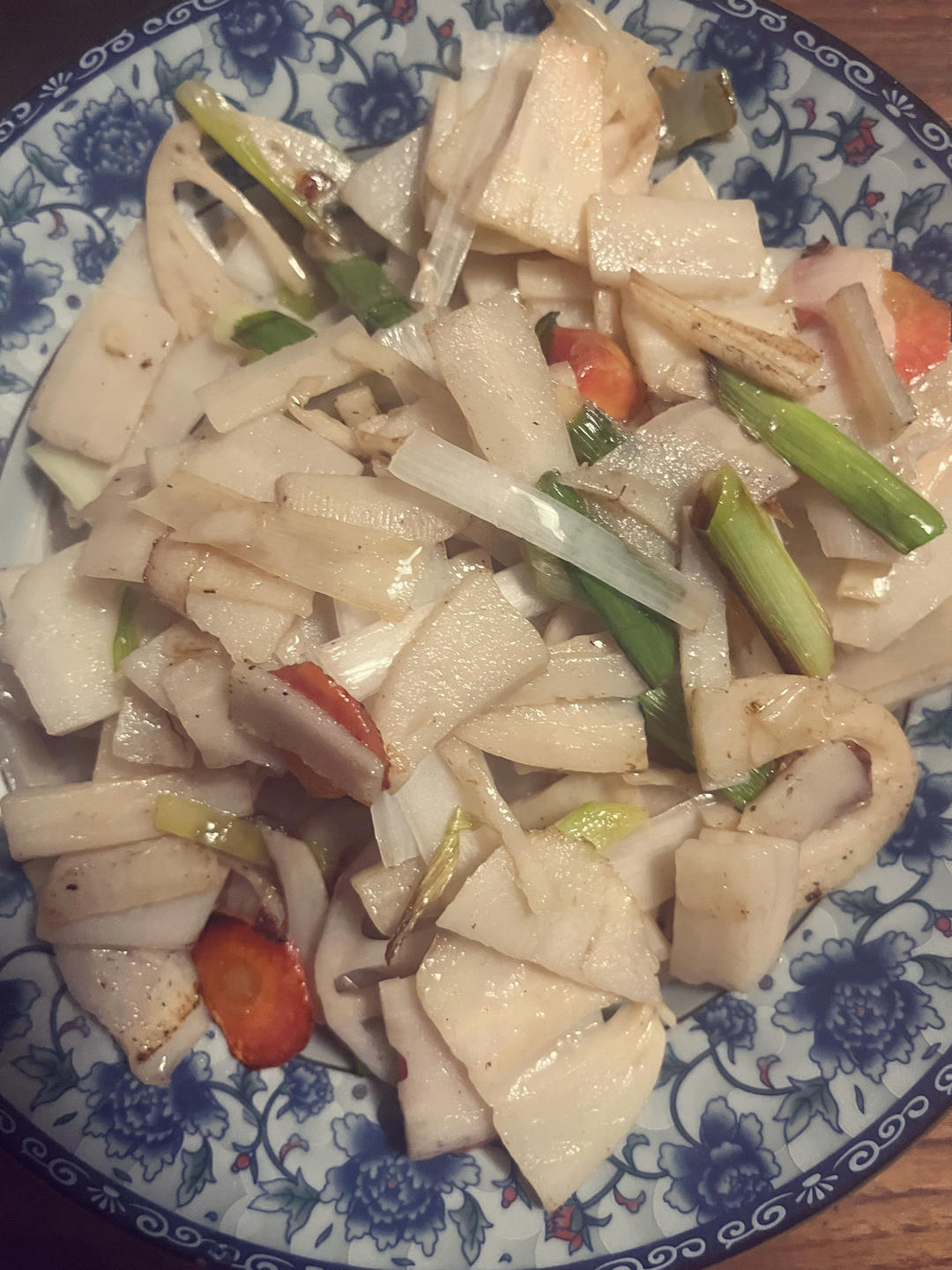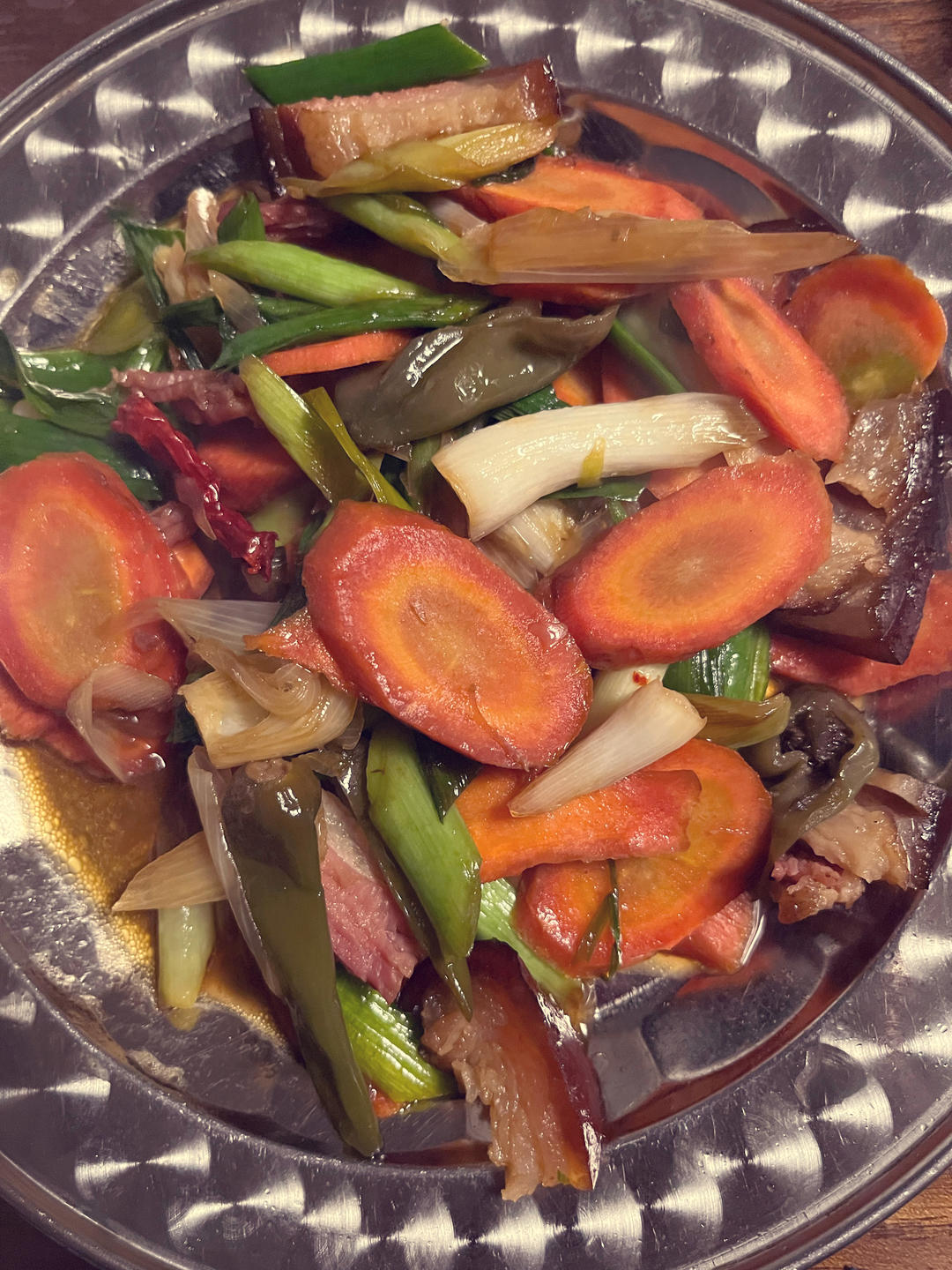 胡萝卜蒜苗炒腊肉,炒土豆丝。胡萝卜有增加冠状动脉血流量,降低血脂,促进...