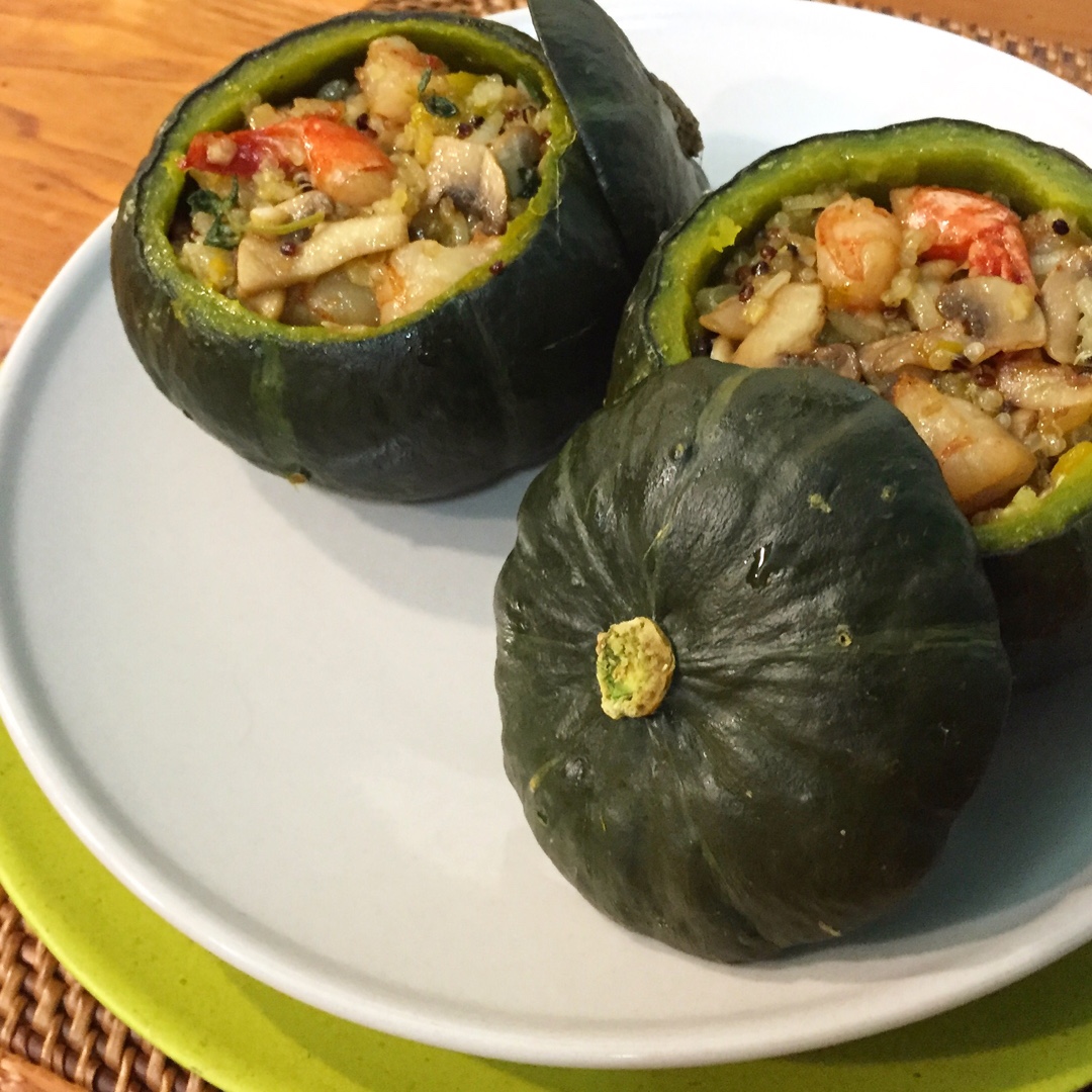 迷你藜麦糯米南瓜盅,第二次做味道好很多,里面放了越南大虾和白蘑菇,临出锅还融了片芝士片!