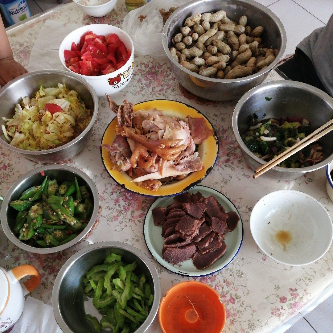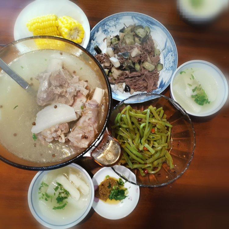 今日午餐打卡:山药萝卜炖羊肉汤,杏鲍菇茄子炒驴肉,凉拌贡菜,蒸水果玉米,主食米饭。