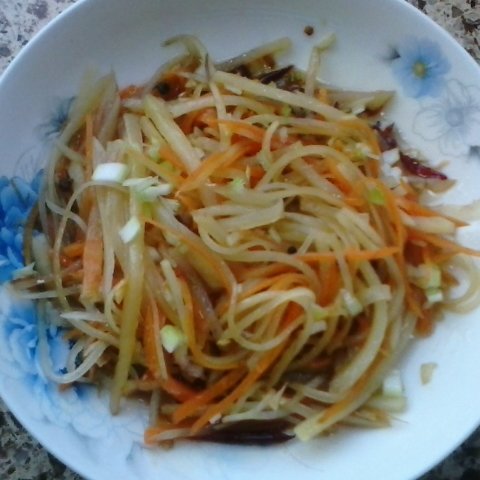 小米粥配凉拌二丝(红萝卜和土豆丝),我的清爽早餐。