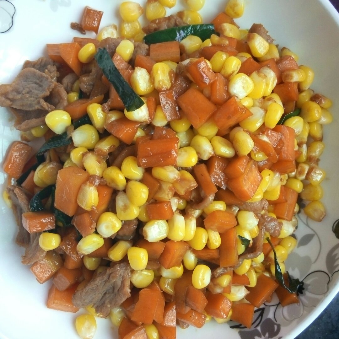 肉片炒玉米胡萝卜&洋葱炒五花肉伴蒜叶。