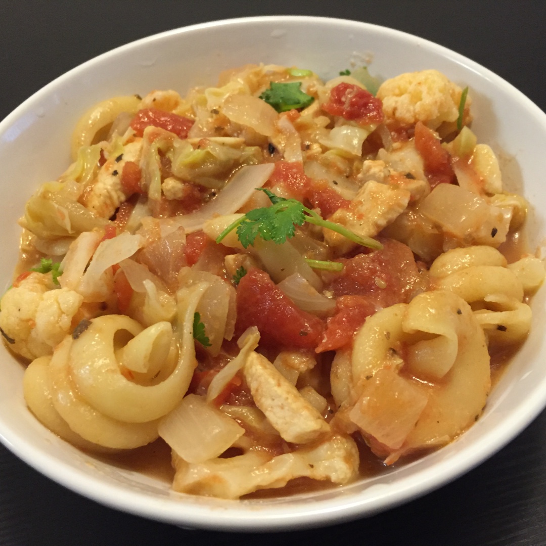 (这个菜谱的名字不能再合适hh…)逛超市看到一种奇形怪状的pasta就买了,加了鸡肉花菜包包白番茄罐头牛奶等等,在减肥没...