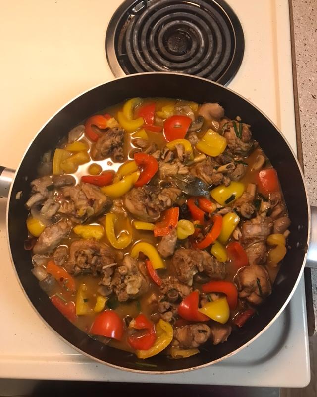 就是,炖鸡腿一锅。本来想做大盘鸡,但是忘记买土豆和胡萝卜,只好加了口蘑和辣椒,一样很美味啊。#Happy weekend...