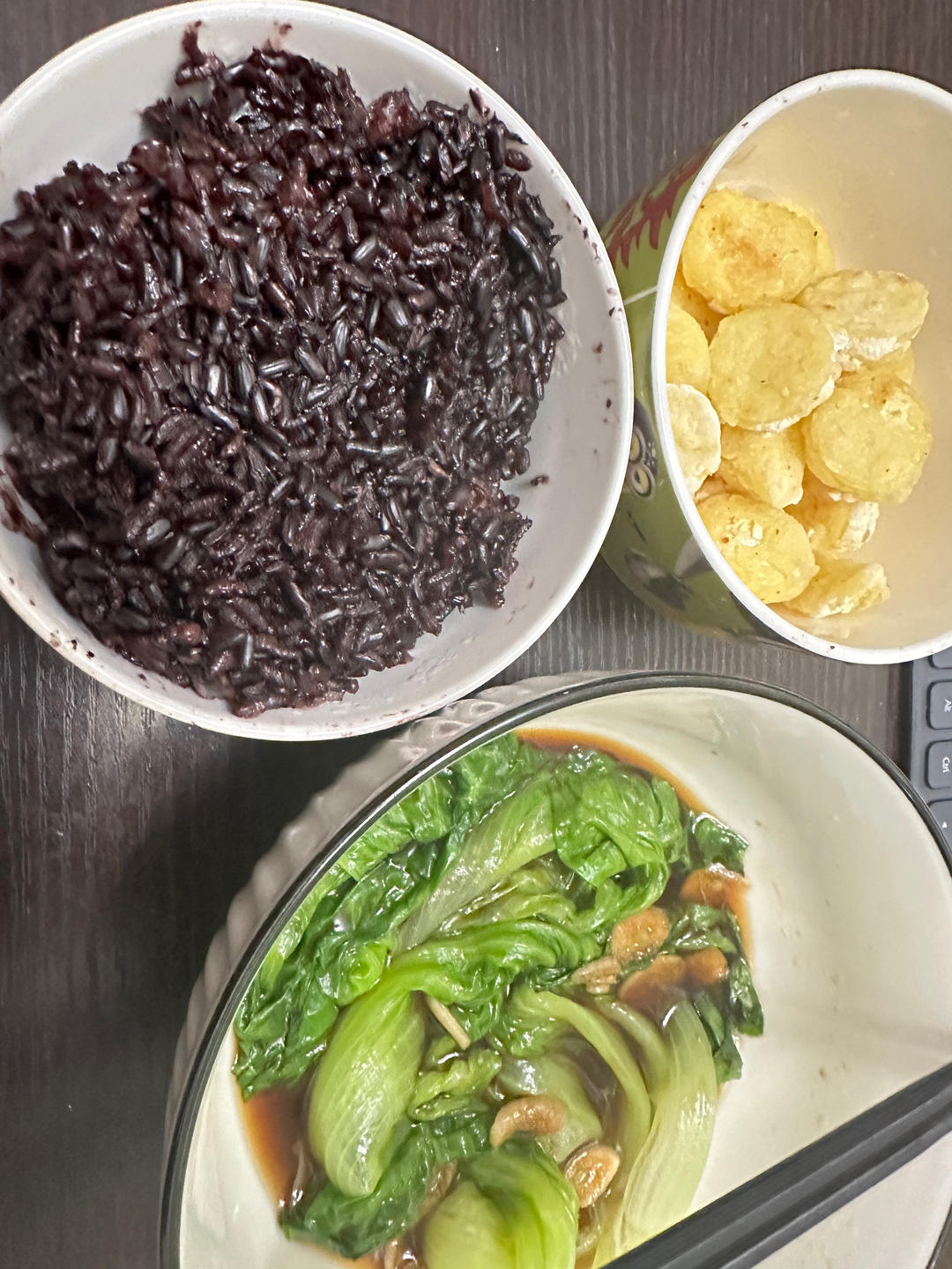 黑米面小花卷,黑米面糖三角,皮蛋瘦肉粥,糖醋排骨,蚝油蟹味菇,白灼西生菜,海鸭蛋,红心芭乐