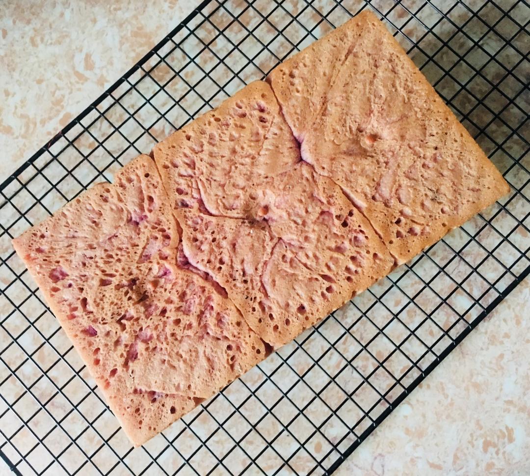 夏天的话,牛奶冻成冰渣,因为是提前做好的紫薯泥,解冻到可以擀开就直接铺上去。