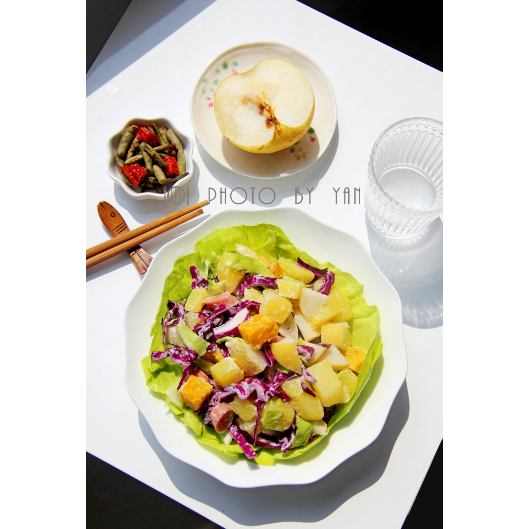 存图。醋溜西葫芦,水果,馒头,山楂片。