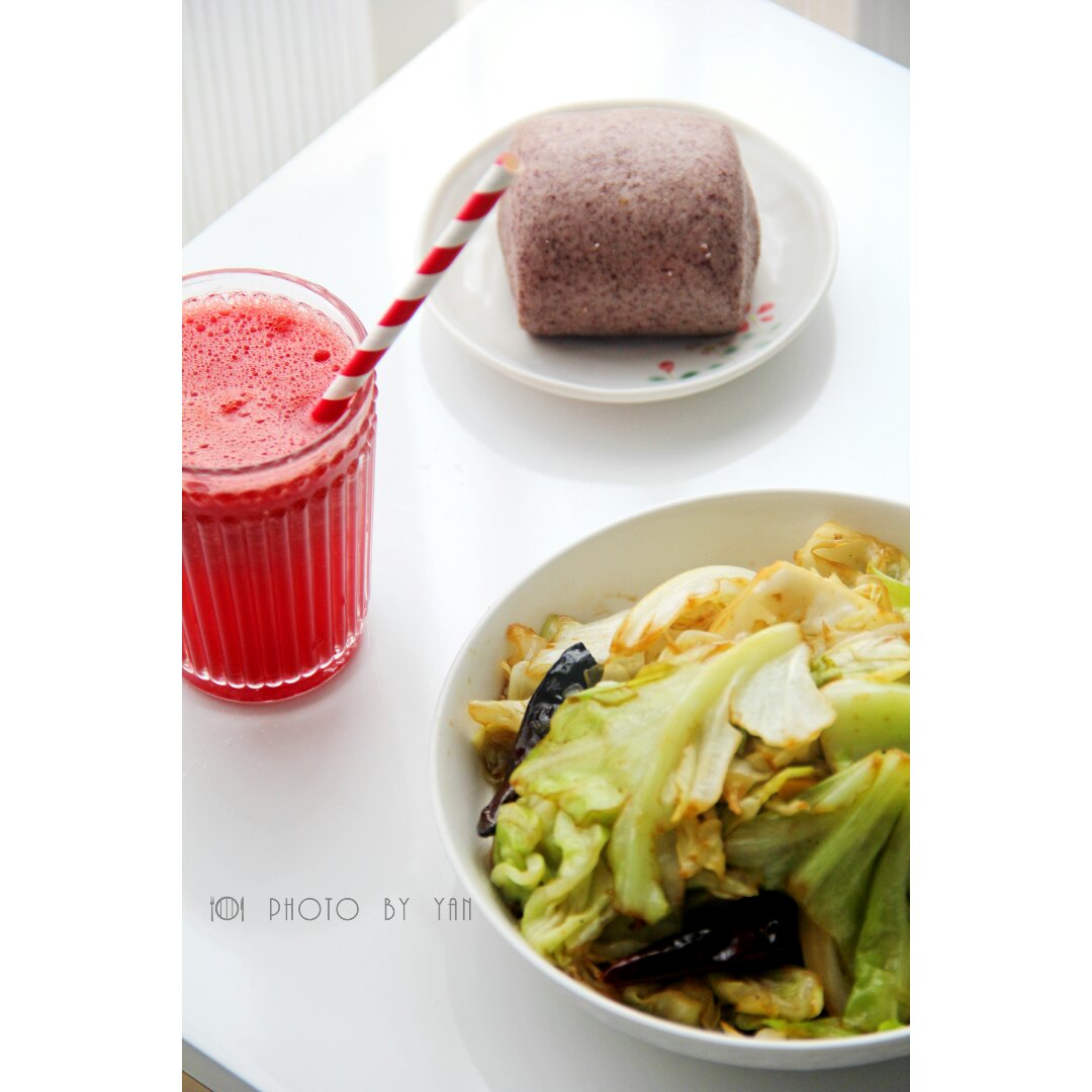 手撕包菜,黑米馒头,西瓜汁。