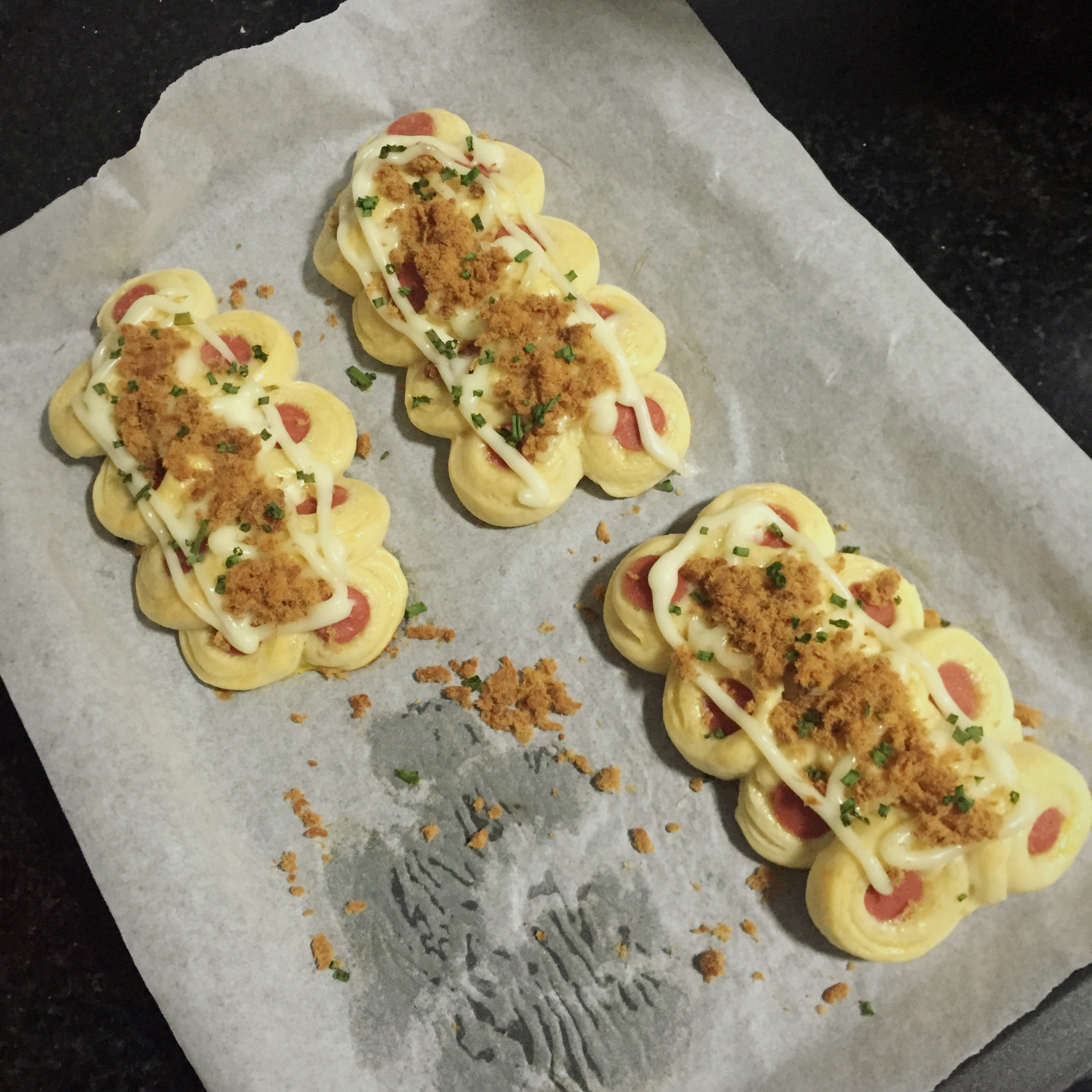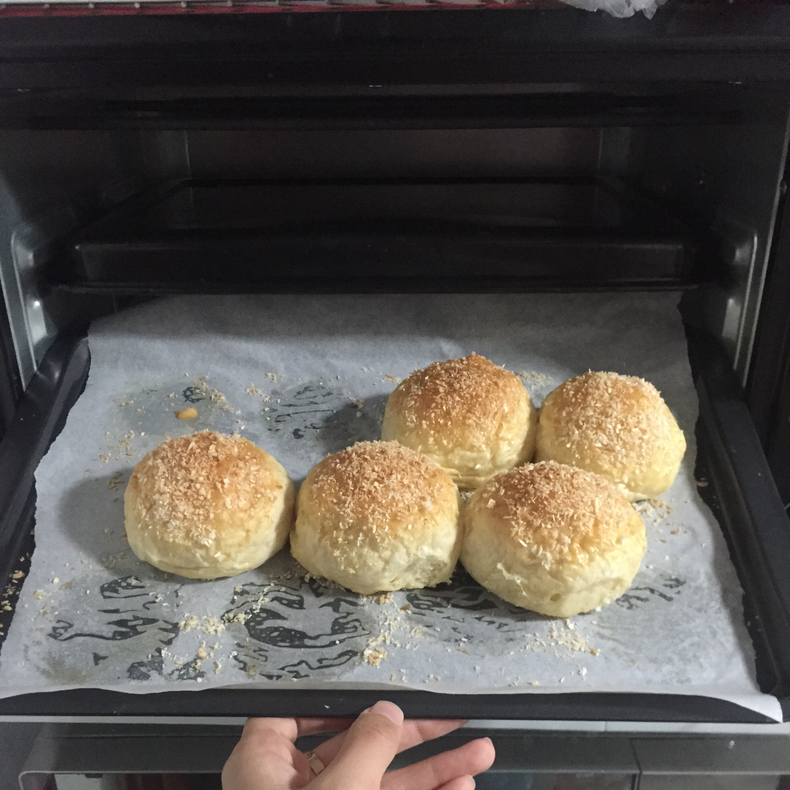 我在想,我们烤之前先刷层蛋黄。等到时间剩下5分钟时候拿出来,再轻轻刷一点蛋黄,然后撒上椰蓉,是不是就不...