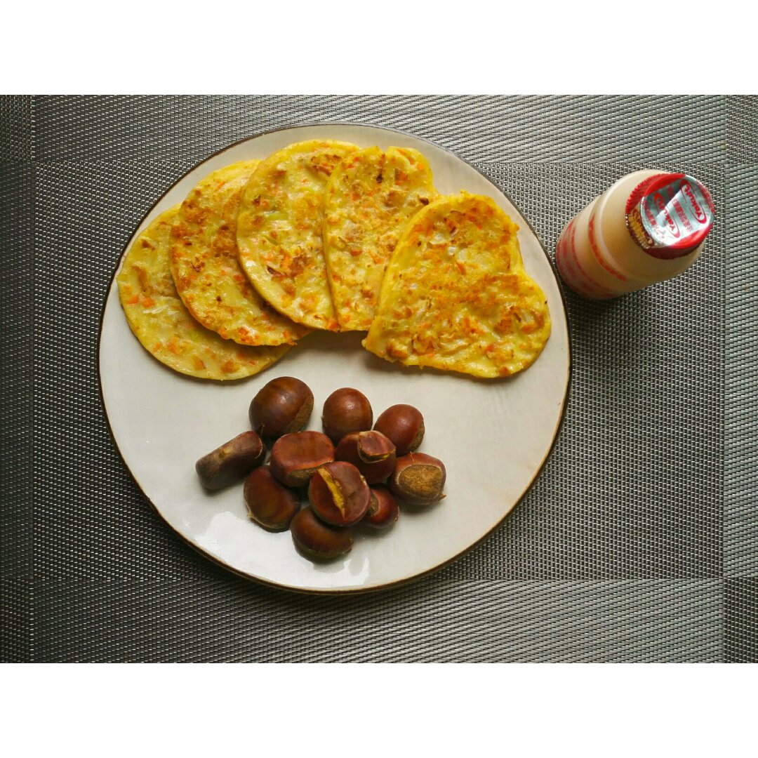 圆白菜胡萝卜鸡胸肉丝饼&栗子&养乐多。总算摊饼摊成功啦,...