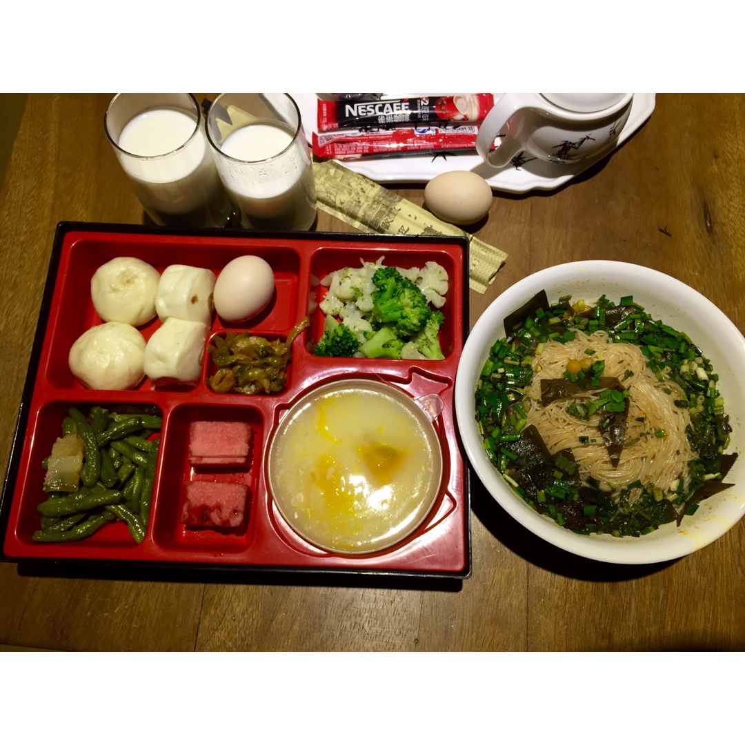 这是今天酒店送到房间里的早餐, 一份米饭, 一份粥. 九点多睡的迷迷糊糊的好像闻到香味了. 突然想起昨晚订了早上8 点...