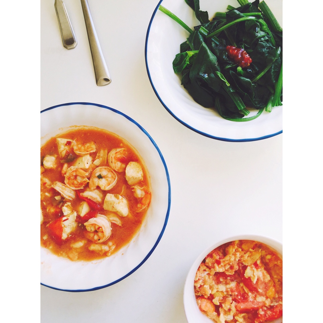 在舅舅舅妈家不自觉开始做中国菜了(:3 番茄虾仁豆腐煲,凉拌菠菜,番茄炒蛋。真是中西式随意切换不带过度的呢😂 中国菜里放...