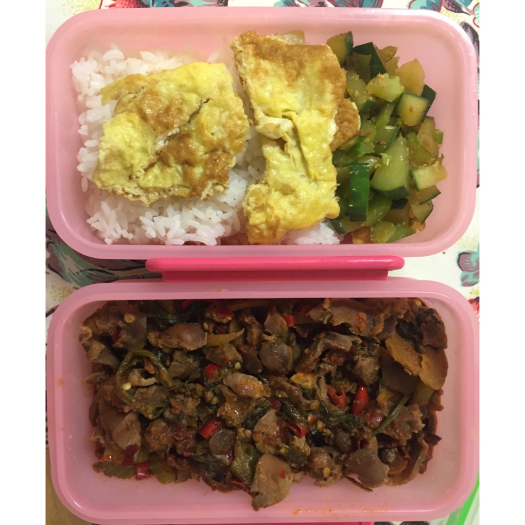 明日便当之重口味人士专属,辣炒鸡杂,青瓜炒蛋~