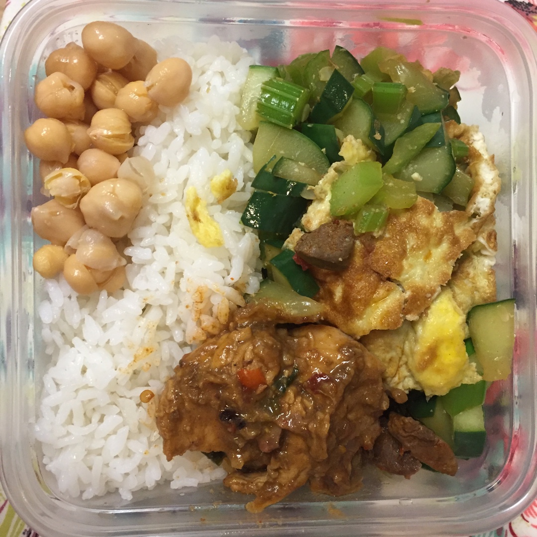 我的明日便当。鹰嘴豆,西芹青瓜炒鸡蛋,鸡胸肉。