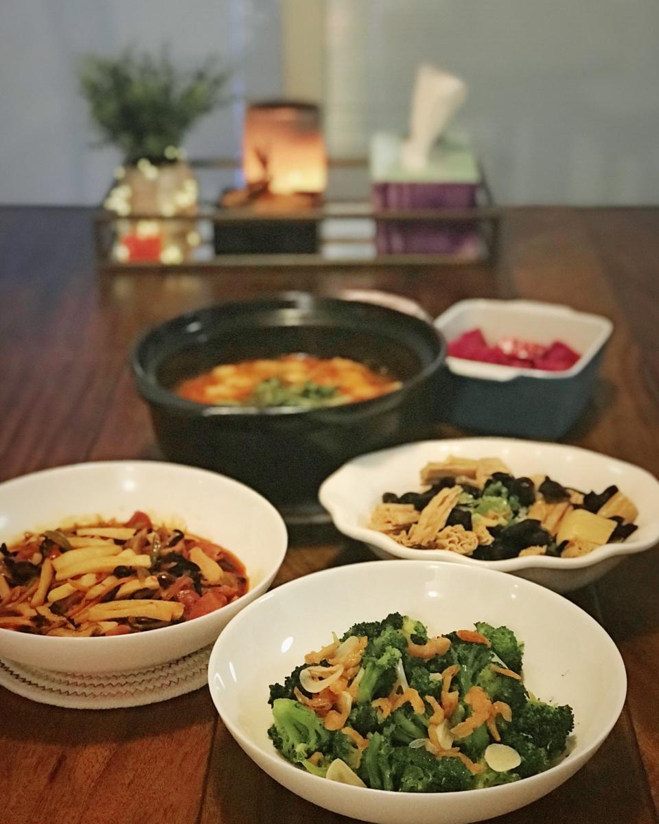 晚餐:浇汁西兰花、鱼香杏鲍菇、番茄鱼片汤和腐竹凉拌木耳~[馋嘴] #
