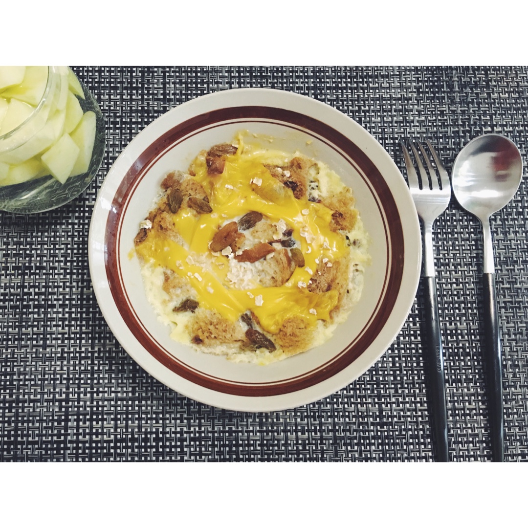 牛奶吐司布丁配苹果水。