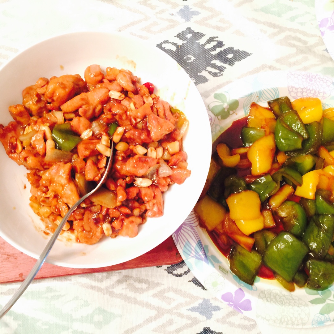 这样的太平饭吃一顿少一顿。灶台上左右开工~左边缺德舅的宫保鸡丁半成品,右边快手油焖青椒,都是下饭菜,米道来得额好! #晚...