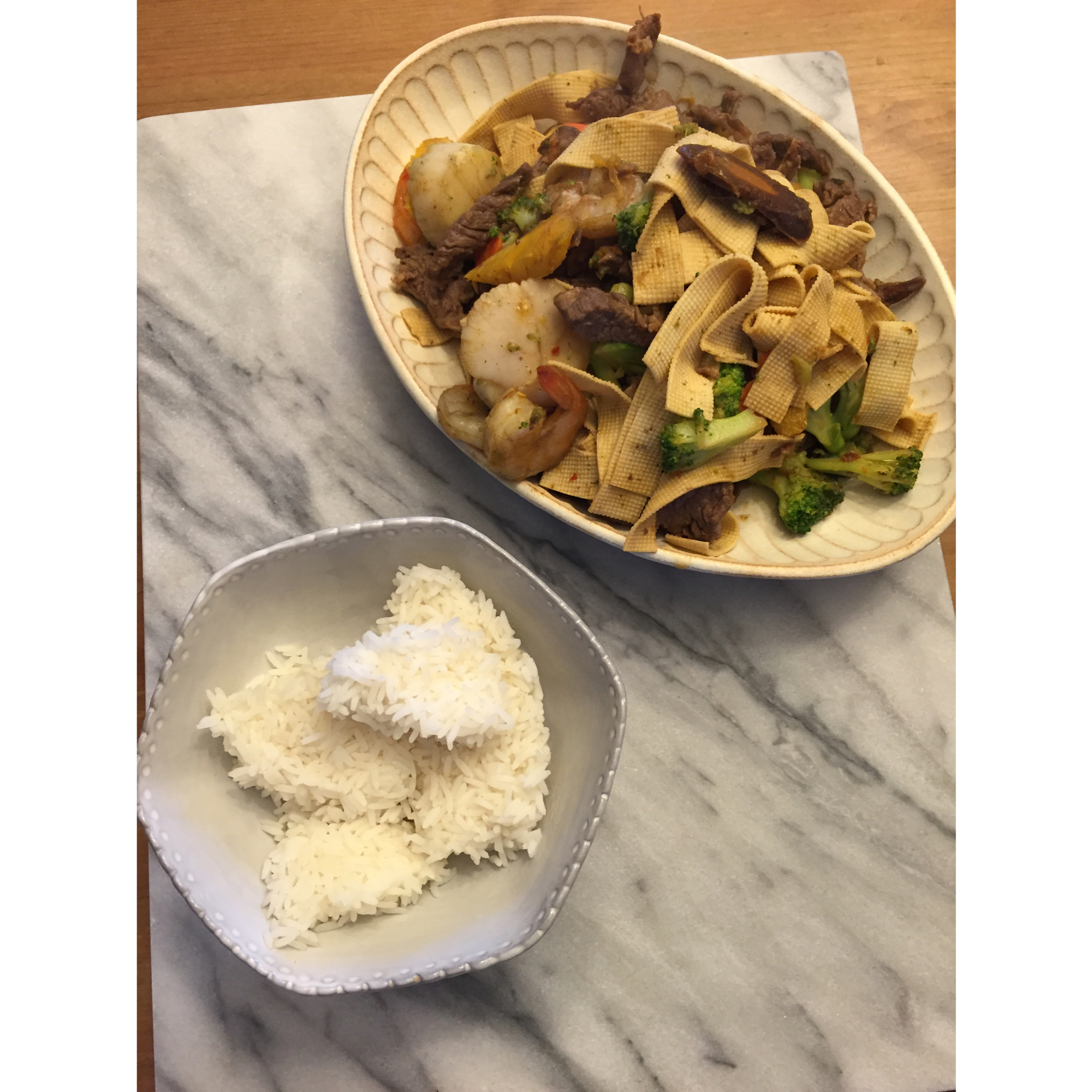 炒 牛肉 虾 带子 豆皮 西兰花 三种不同颜色的胡萝卜