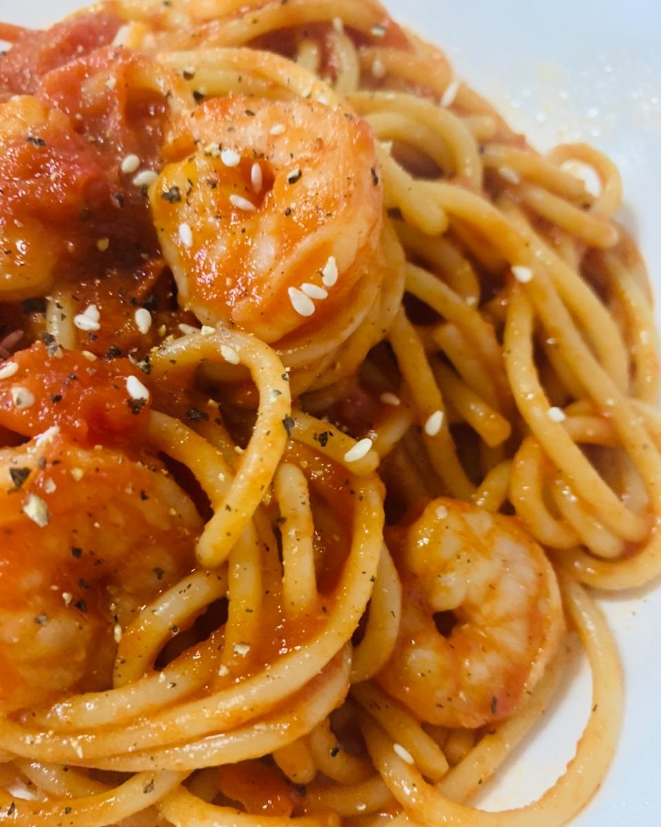 今日份番茄虾仁意面,味道不错给自己点赞👍意面Gigl都不算太高,番茄也是,减肥期适量解馋~