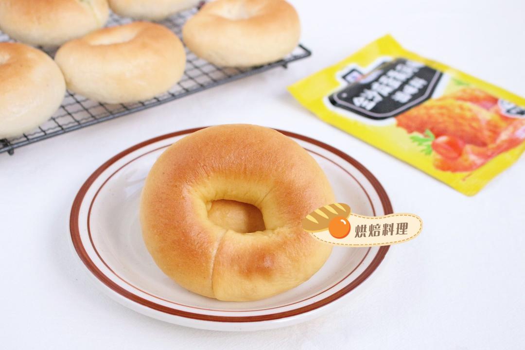 基础贝果面团里+适量金沙咸蛋黄调料,揉出漂亮的黄色面团。馅料是甜沙拉酱+海苔肉松