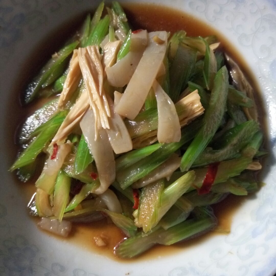 西芹腐竹拌猪皮,番茄烧鳕鱼,外加炒面。饱饱哒