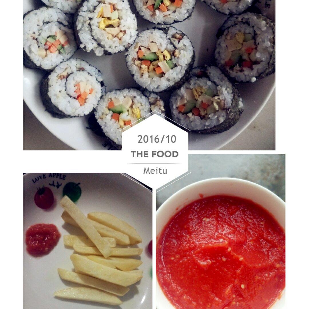 剩米饭的又一个好去处——紫菜包饭。手动炸薯条配自己做的番茄酱,酸酸甜甜超好吃(...