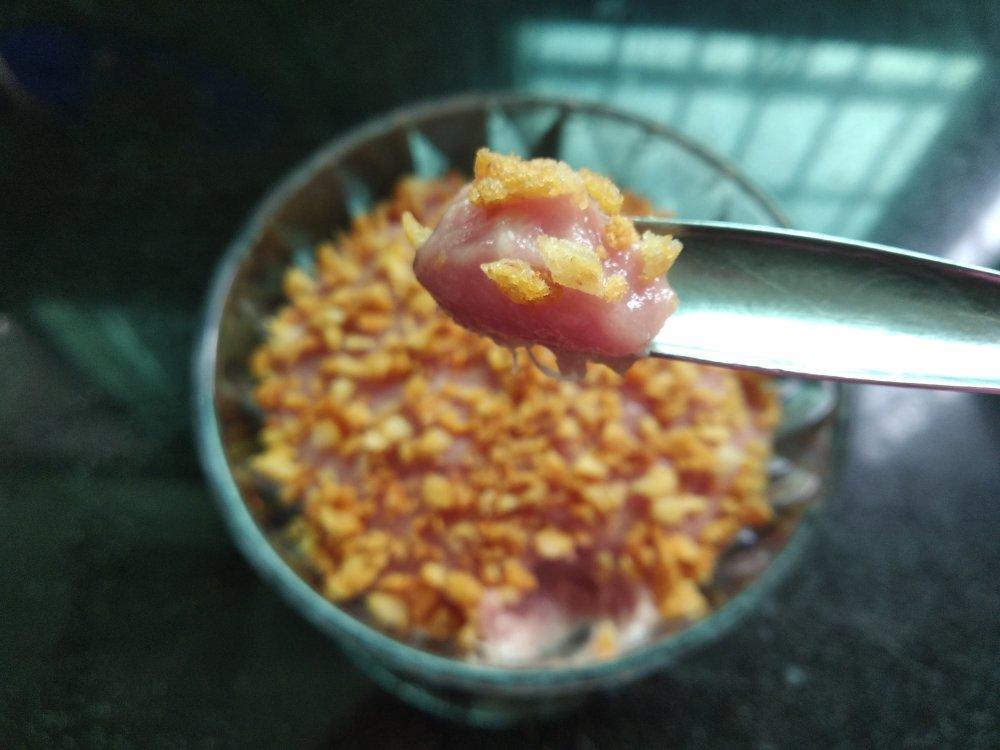 头一天剩下的后腿肉剁碎,用咸鸭蛋白代替盐巴和水搅拌上劲,另外加点味精和地瓜...
