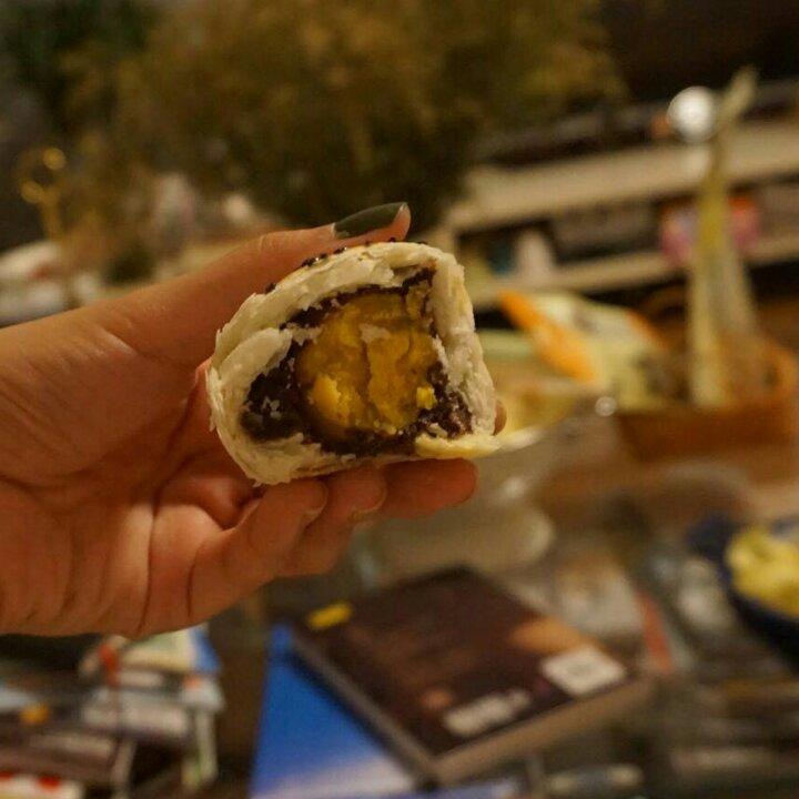 晚上烤的蛋黄酥放在桌上,12点了小棉袄饿...