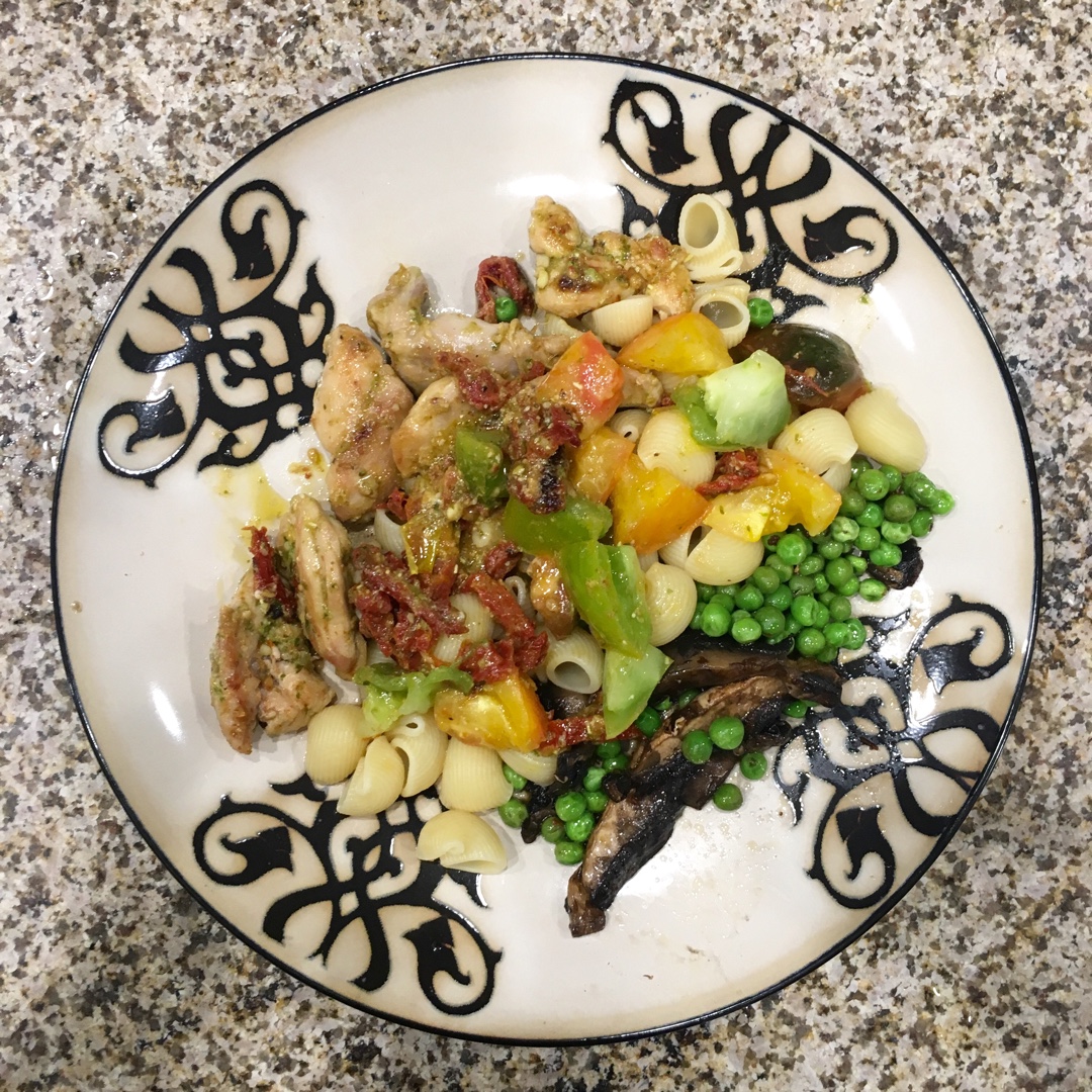 油浸番茄青酱鸡肉意面配青豆绿番茄巨型菇