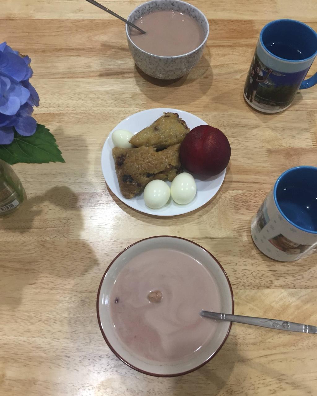 终于有个正常的周六 早餐 粽子 水煮蛋 香芋红豆汤 黄桃 今年Costco 的白桃为什么还没上市