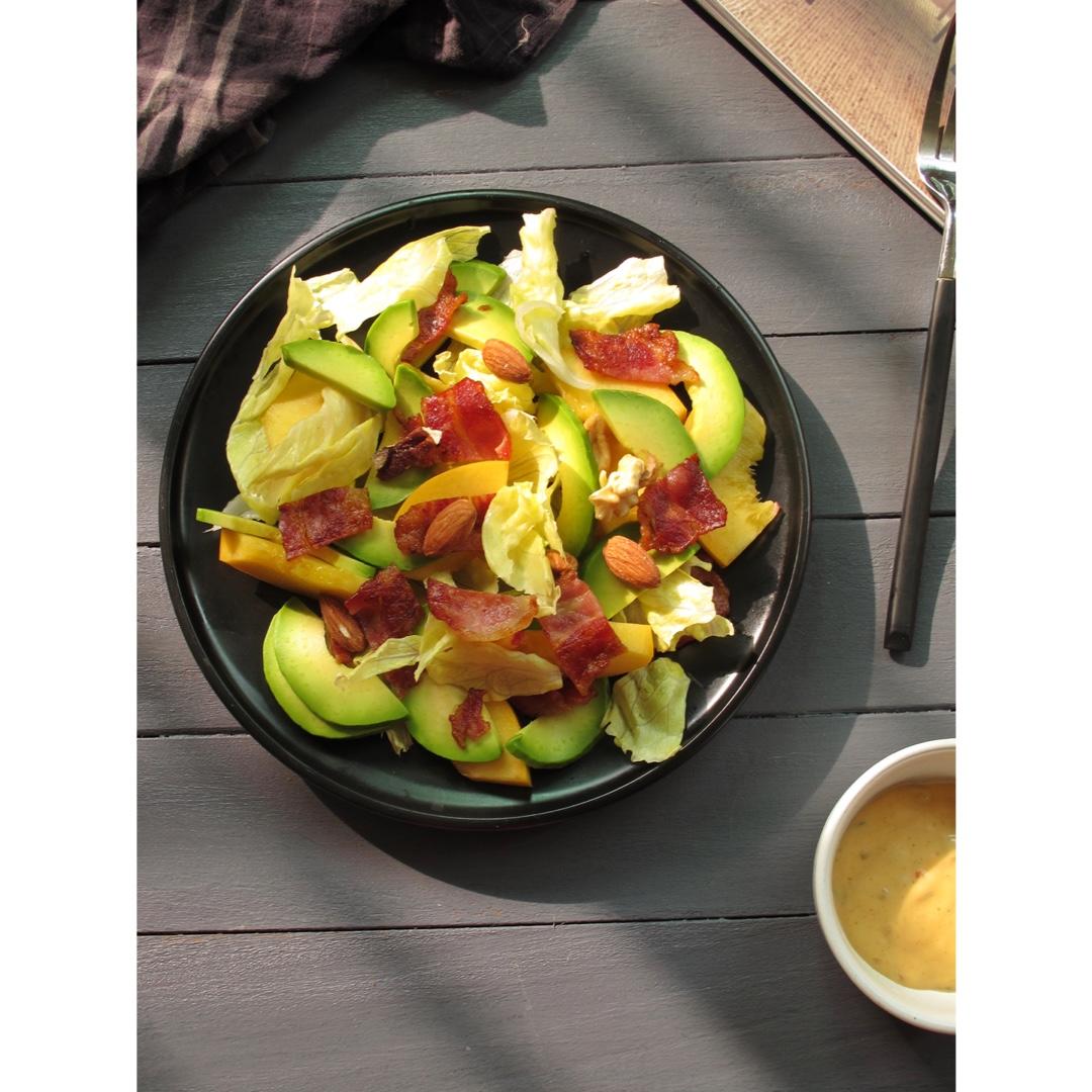 周末以为会降温,结果短袖还是继续穿。是日沙拉,生菜,培根,牛油果等,还有市集买的坚果。