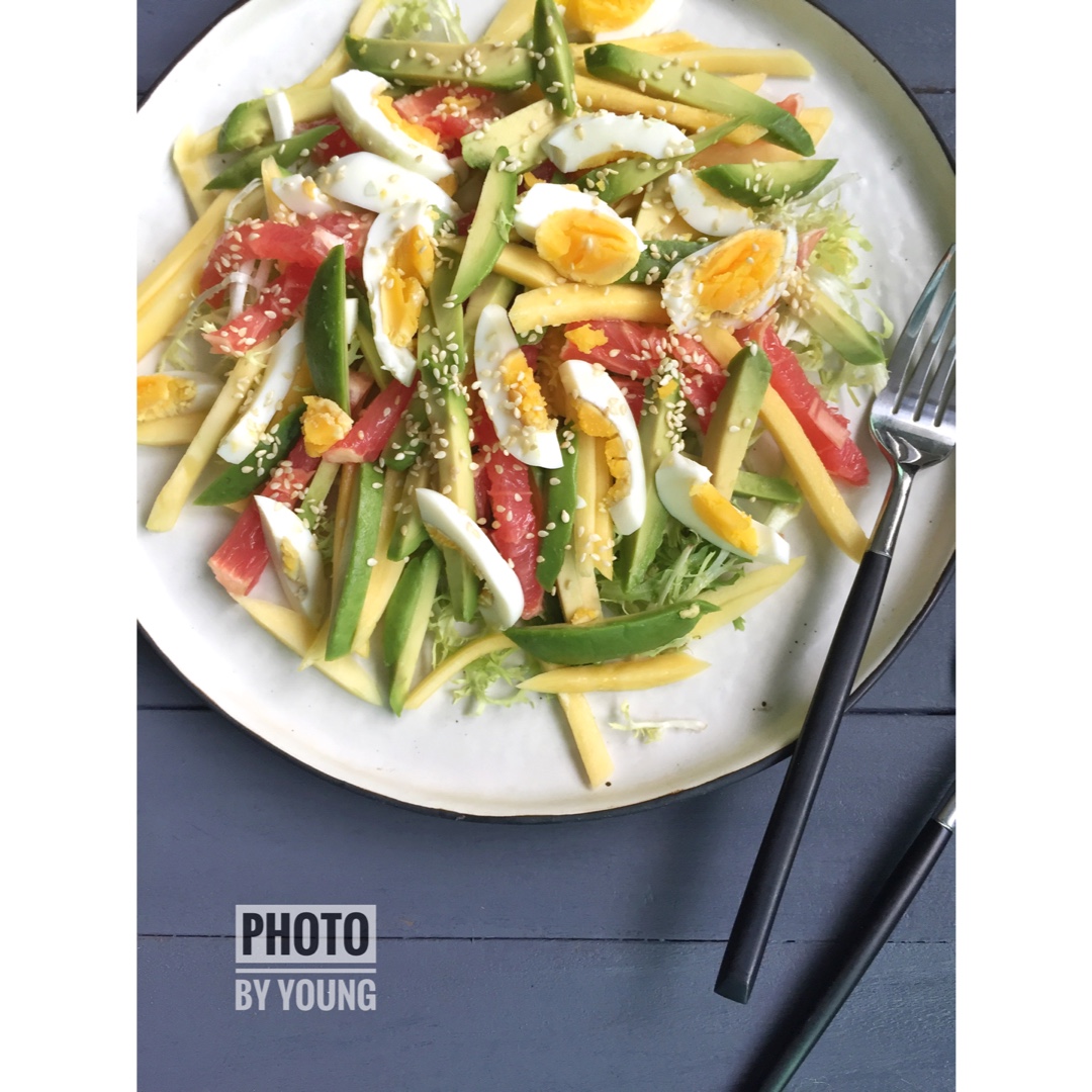 苦菊,芒果,牛油果,西柚,鸡蛋,撒了点白芝麻,一大盘够两个人吃。