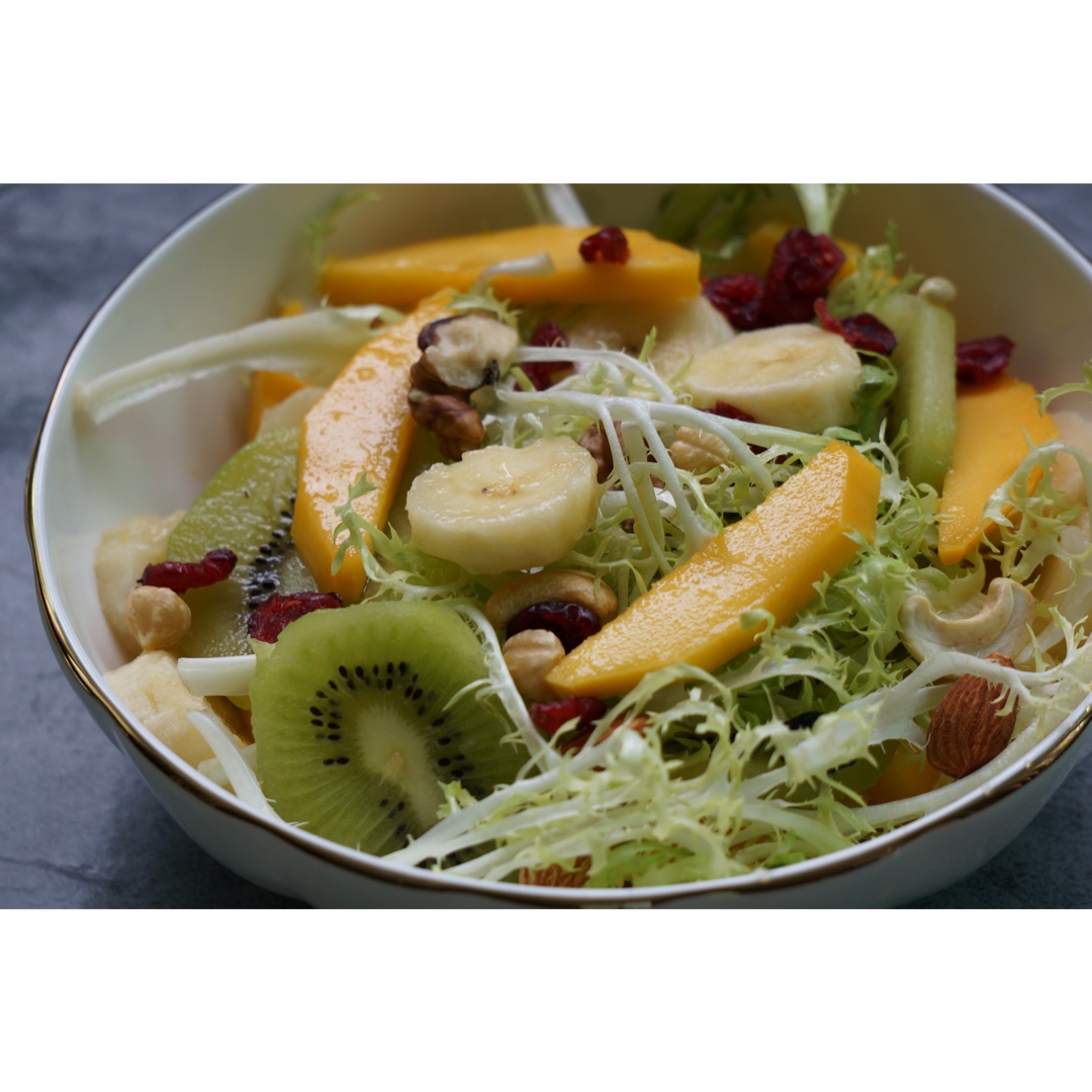 今日沙拉,苦菊,芒果,香蕉,奇异果和市集买的混合坚果。