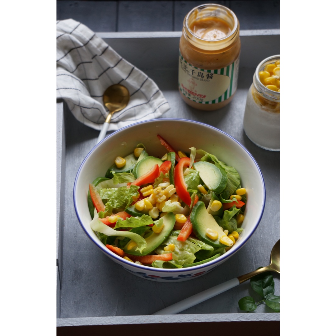 是日沙拉,苦菊,红甜椒,玉米粒,牛油果配千岛酱。