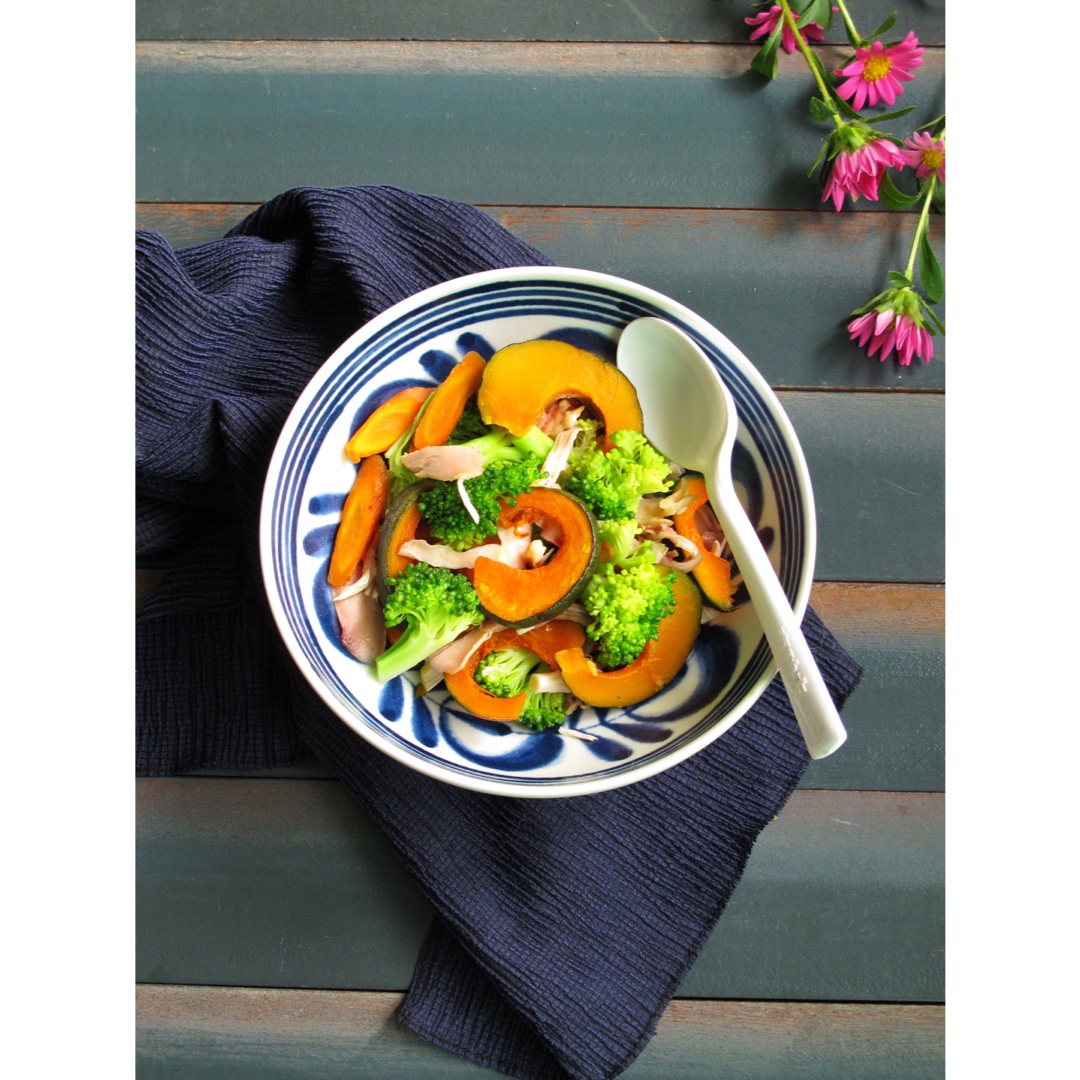 今天吃热沙拉,南瓜,西兰花和烤鸡胸肉。刚好女婿过来,也吃上一碟。