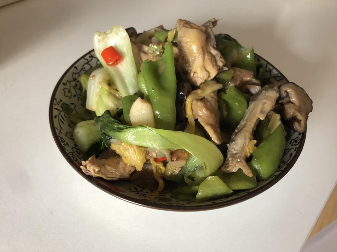 土豆、鸡肉、香菇、辣椒、葱、蒜头、青辣椒。