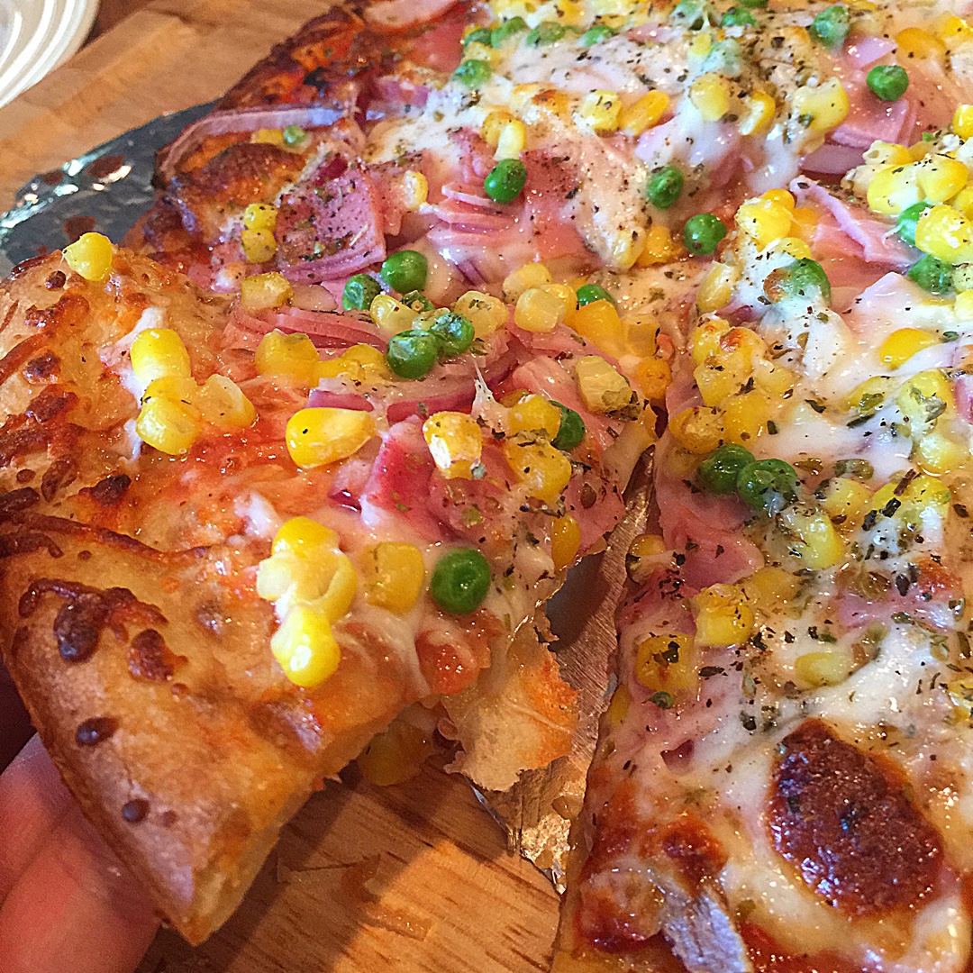 饼底用的是超市里卖的现成的thin crust,先刷一层橄榄油,然后涂一层番茄酱,一层洋葱,再撒了无数多的mozzare...