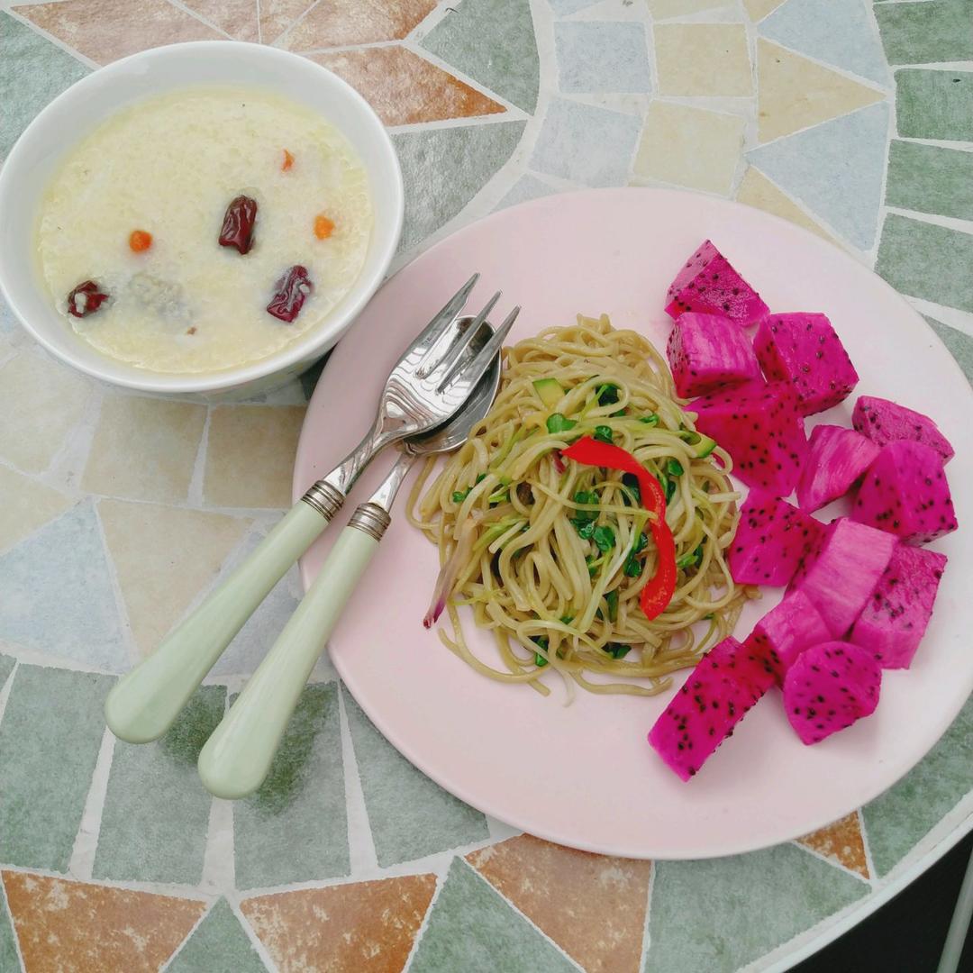 小米粥,辣木炒面,红心火龙果~