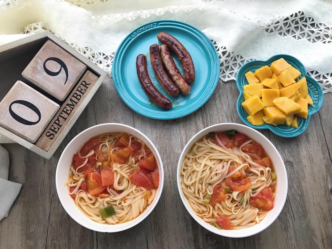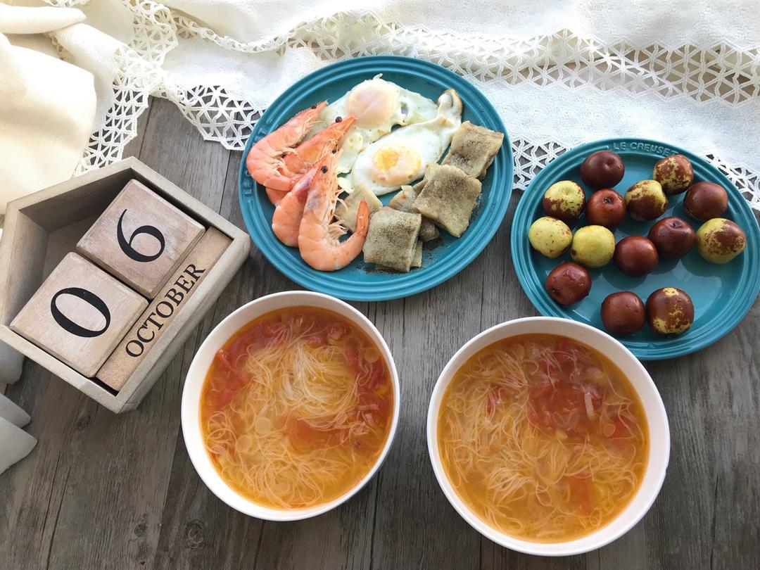 西红柿缀面(空心挂面)、煎蛋、鳕鱼、明虾、冬枣