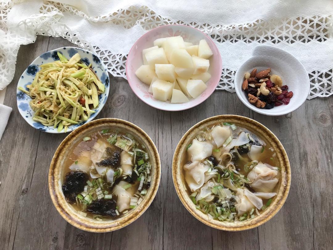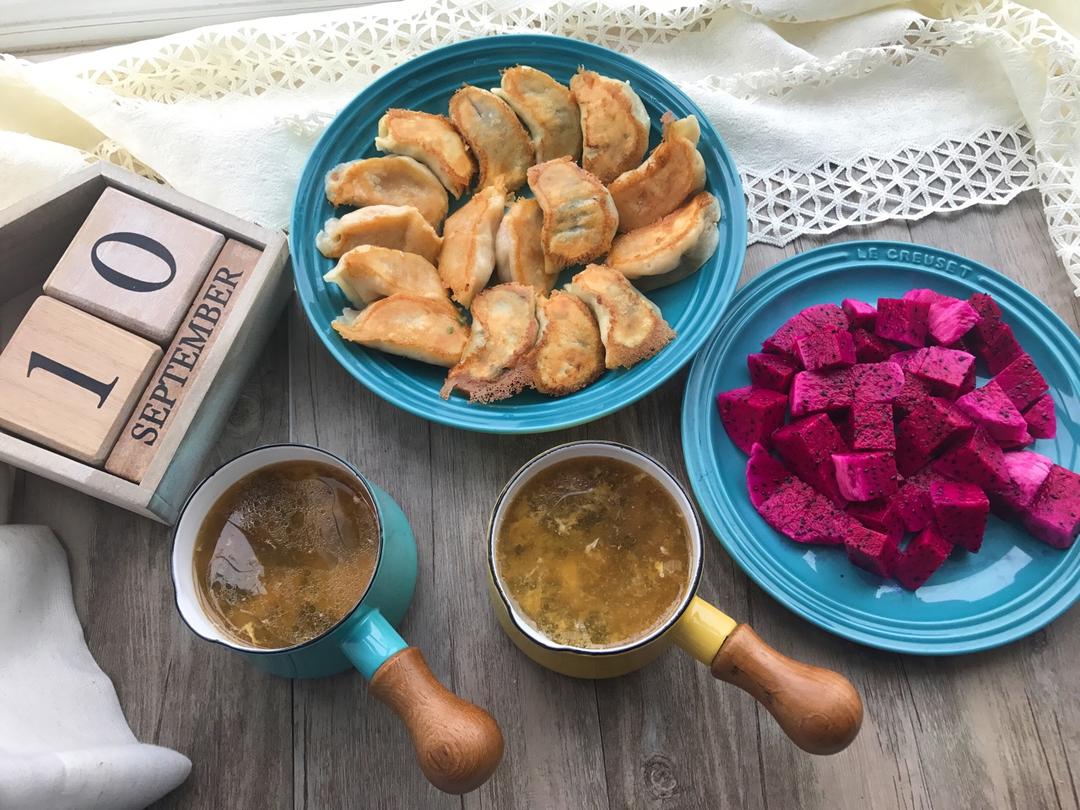 煎饺(素三鲜和玉瓜肉馅儿的)、紫菜蛋汤、红心火龙果❤️