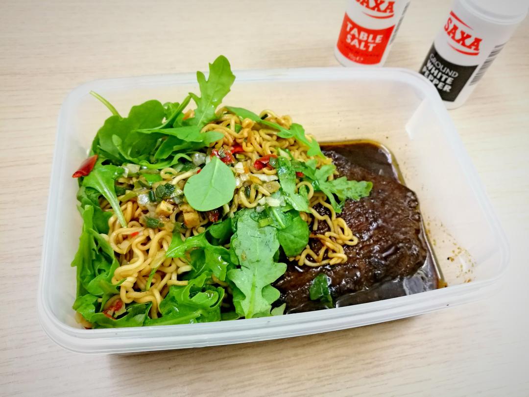 超市里的减价牛排2镑2,加日清拌面1镑,加一包芝麻菜1镑,倒换来倒换去也没比5...