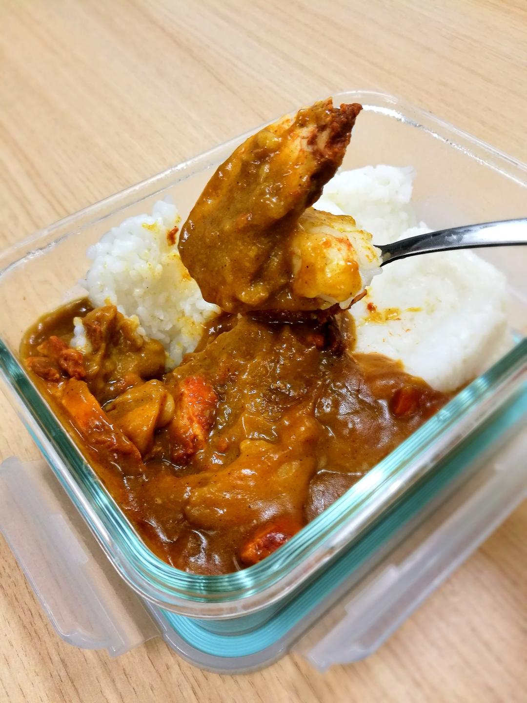 办公室晚餐:咖喱配蔬菜米饭,橄榄油拌生菜沙拉,日式炸鸡串