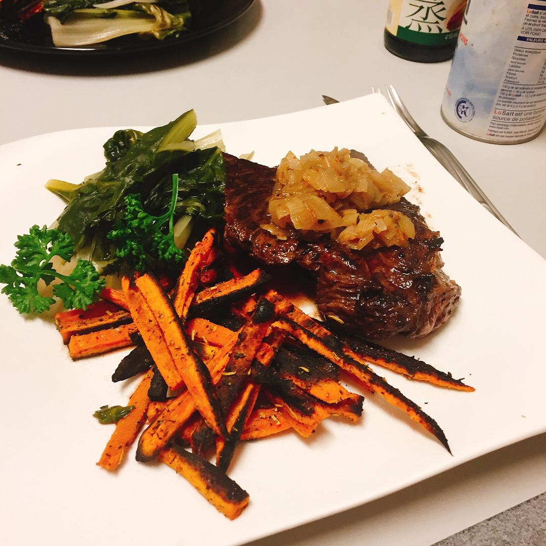存图……忙着去洗澡,红薯条丢烤箱里结果火力太大烧黑了😂配牛onglet(中文不知叫啥,一块纹理特殊的肉,适合做牛排)和煮...