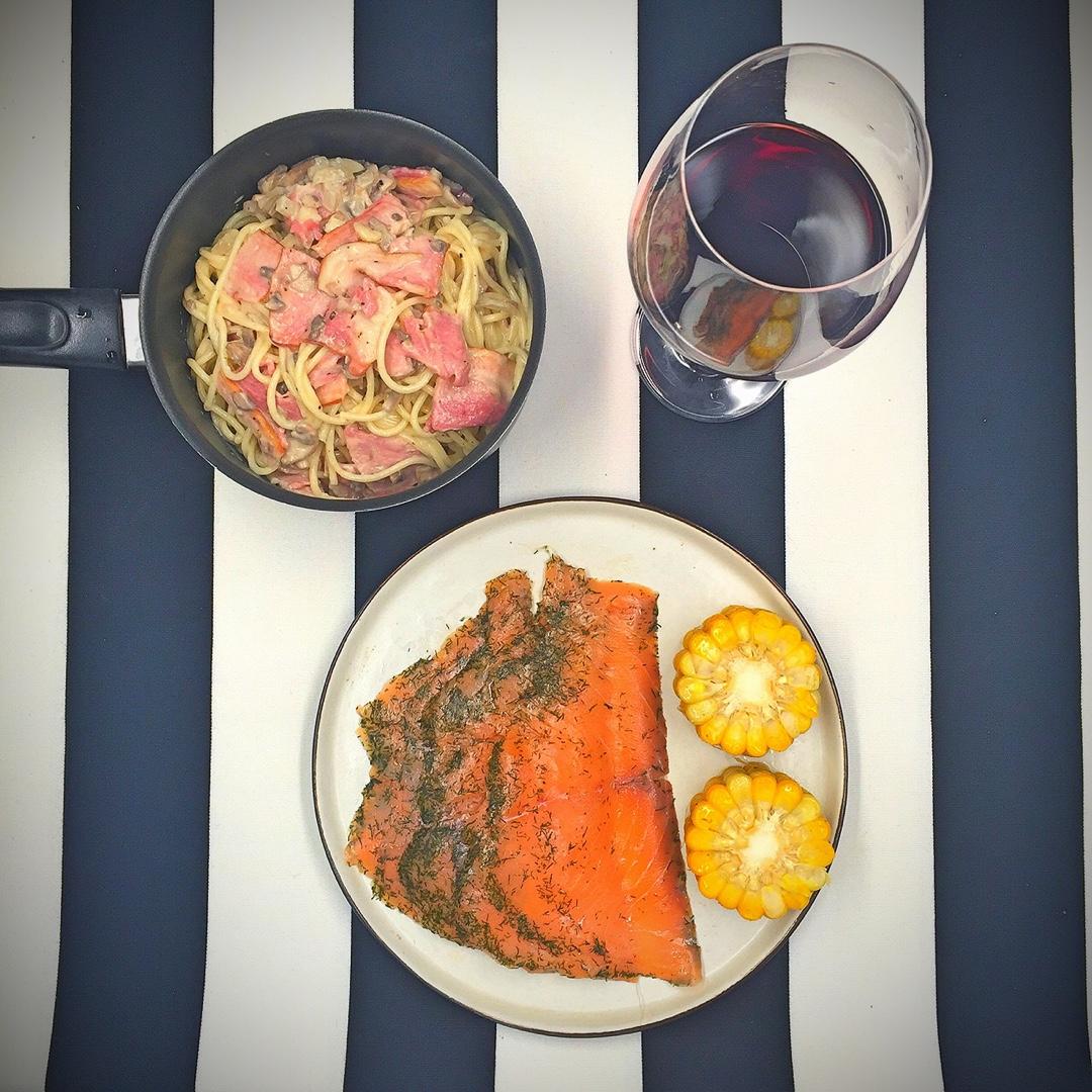 麻麻晚餐【奶油培根蘑菇面➕香草三文鱼➕奶香烤玉米➕红酒】今晚不用给Huey小朋友做晚饭 麻麻可以小酌一下哈哈 #晚餐•2...