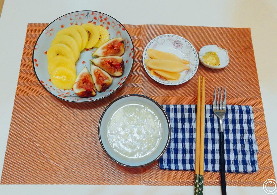 小米百合粥+自腌嫩姜+咸鸭蛋+水果