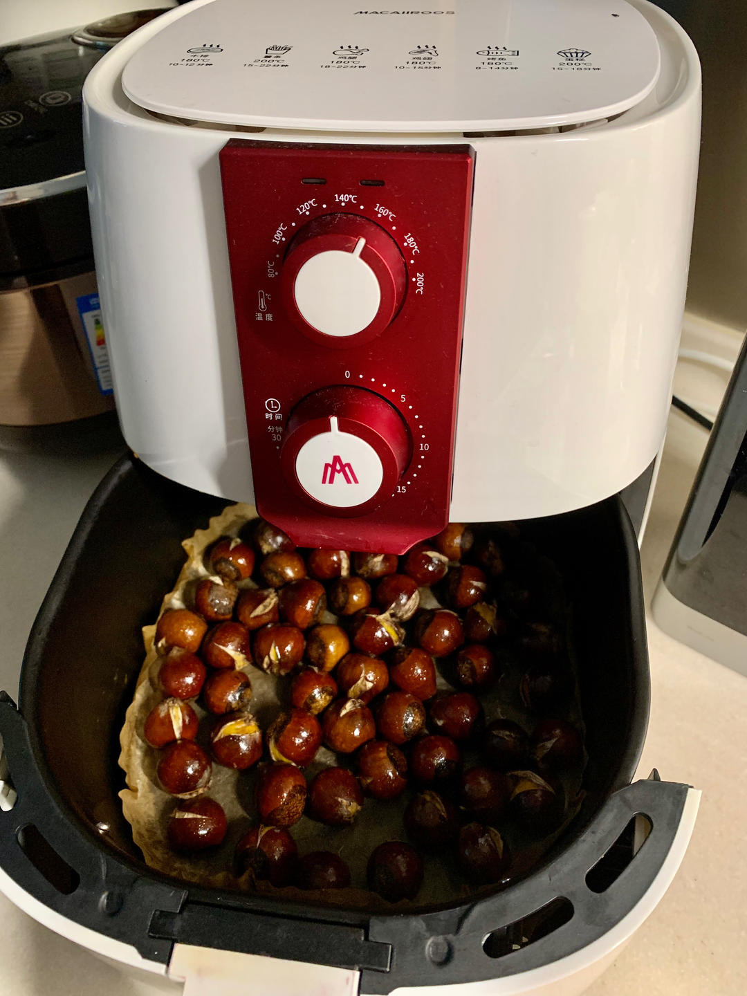早餐的小零食,空气炸锅版糖炒栗子:小板栗剪小切口后入沸水焯3分钟,刷油后放入空气炸锅5分钟,取出刷蜂蜜和水,再180度5...