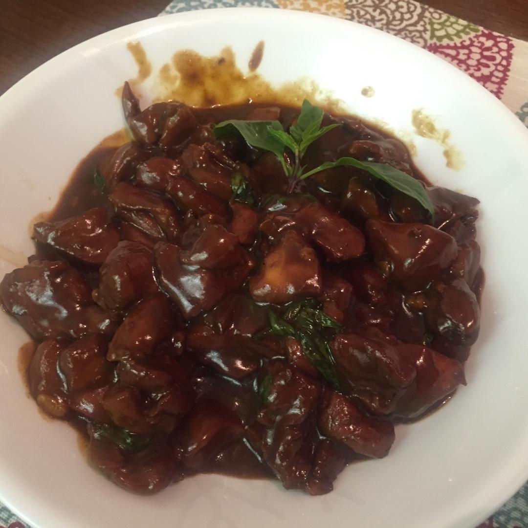 去皮去骨的鸡腿肉,味道好!好像颜色有点重,可能是糖色炒过了吧…