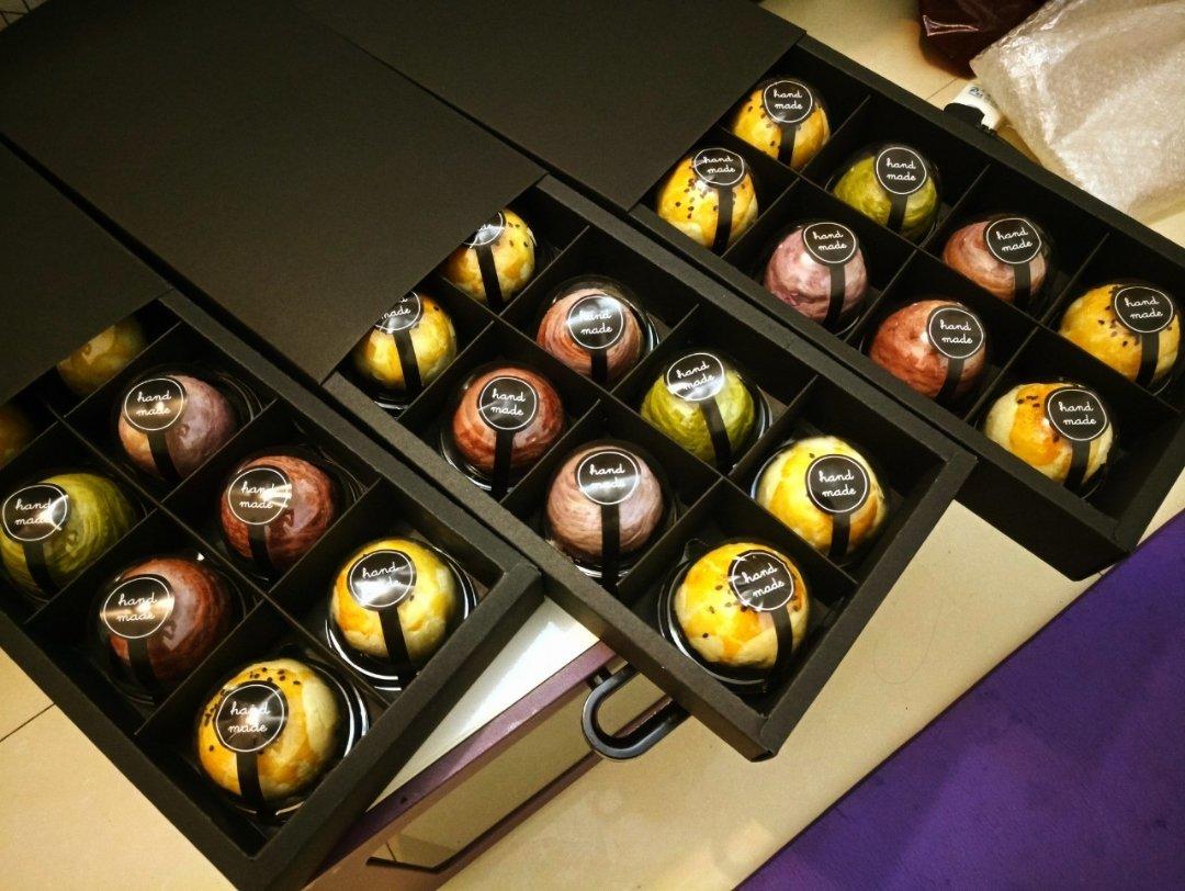 加了抹茶和红曲粉做了其他颜色的蛋黄酥~好好吃!