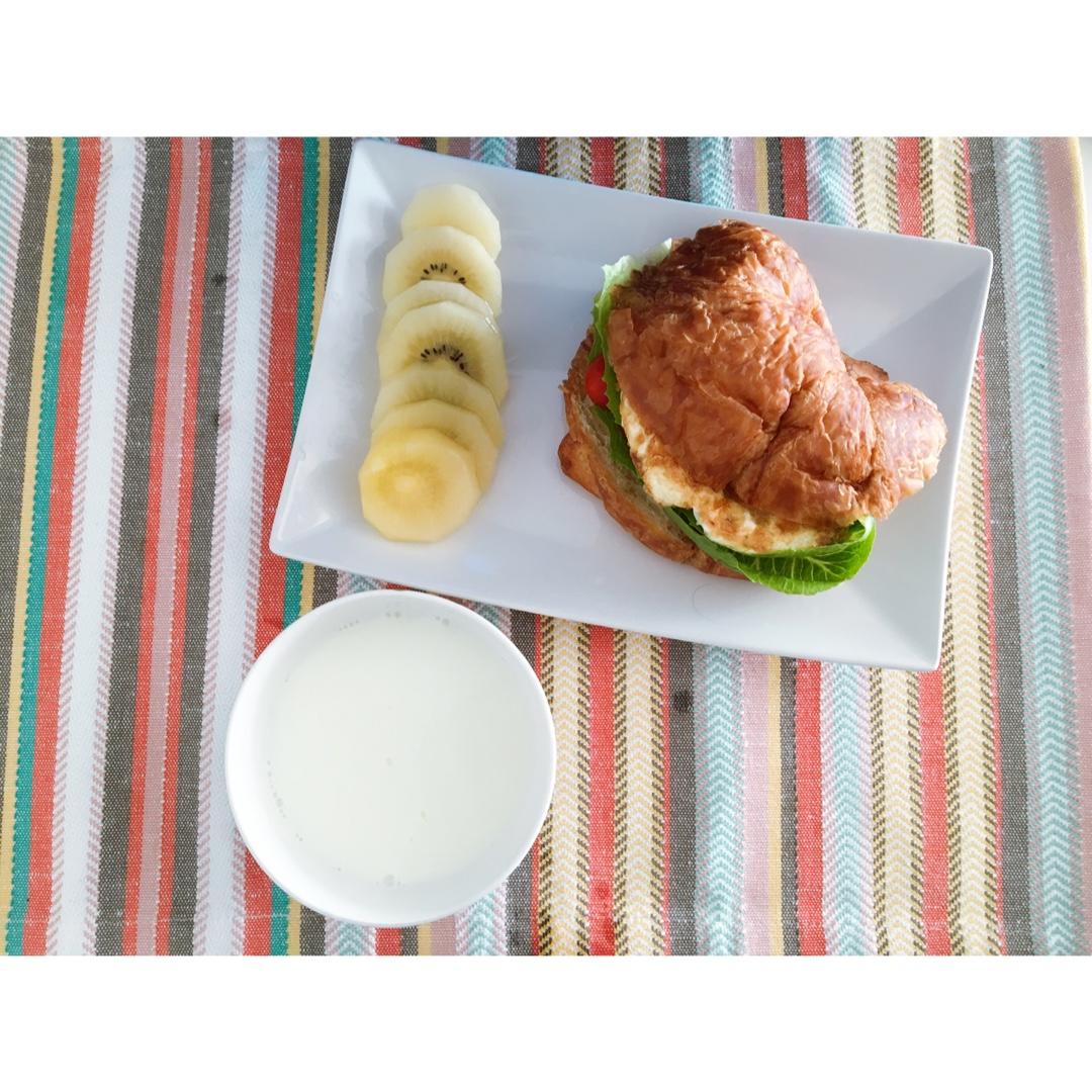 哎呀,今天的早餐我自己都好喜欢哈哈哈,牛角包切开,夹上生菜,圣女果,煎鸡蛋🍳,还有肉松,水果是猕猴桃一个,还有一碗牛奶,...